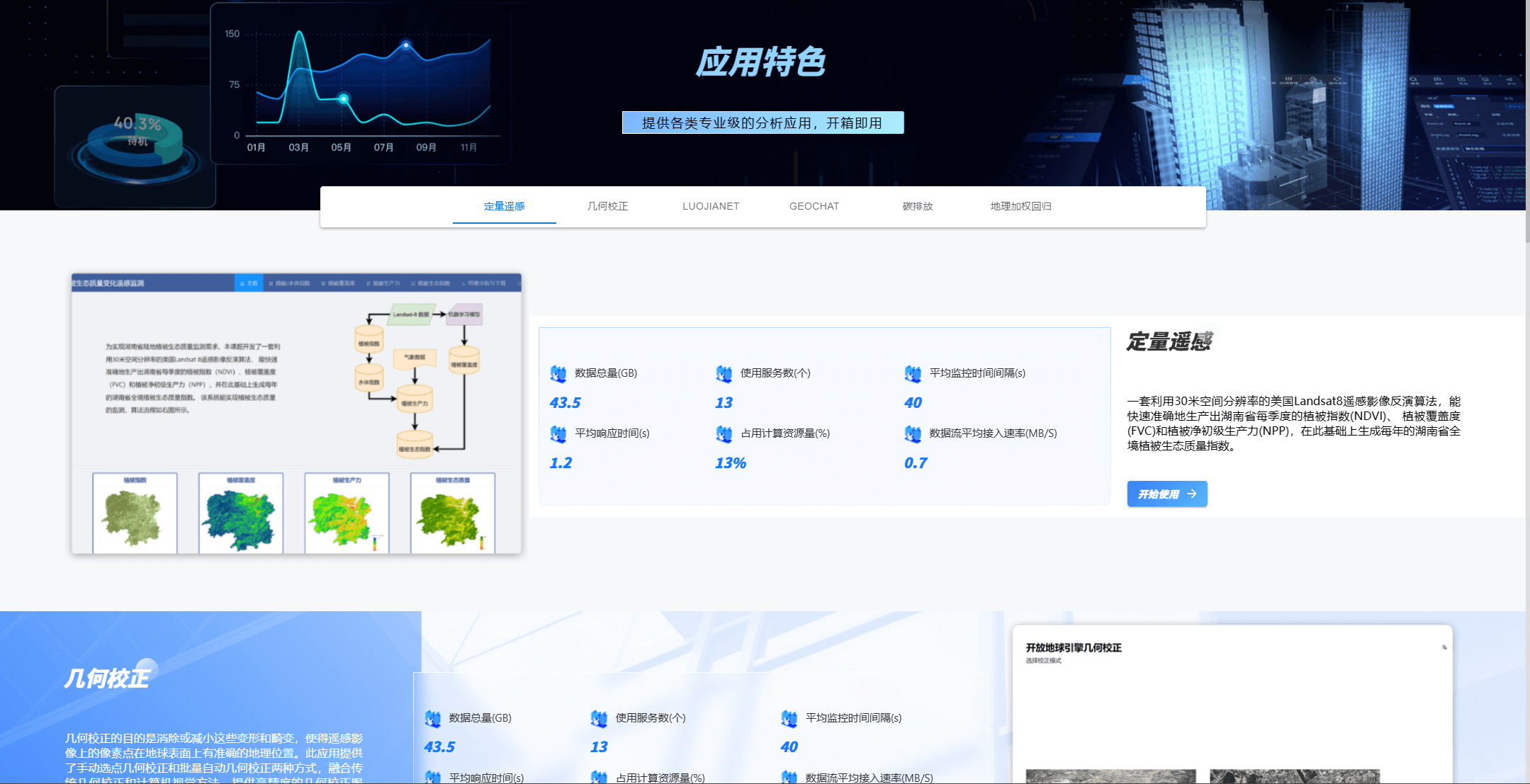提供各类专业级的分析应用,开箱即用,包括定量遥感产品、虚拟星座、三维重建系统、时空知识图谱、水文模型、碳排放模型等。